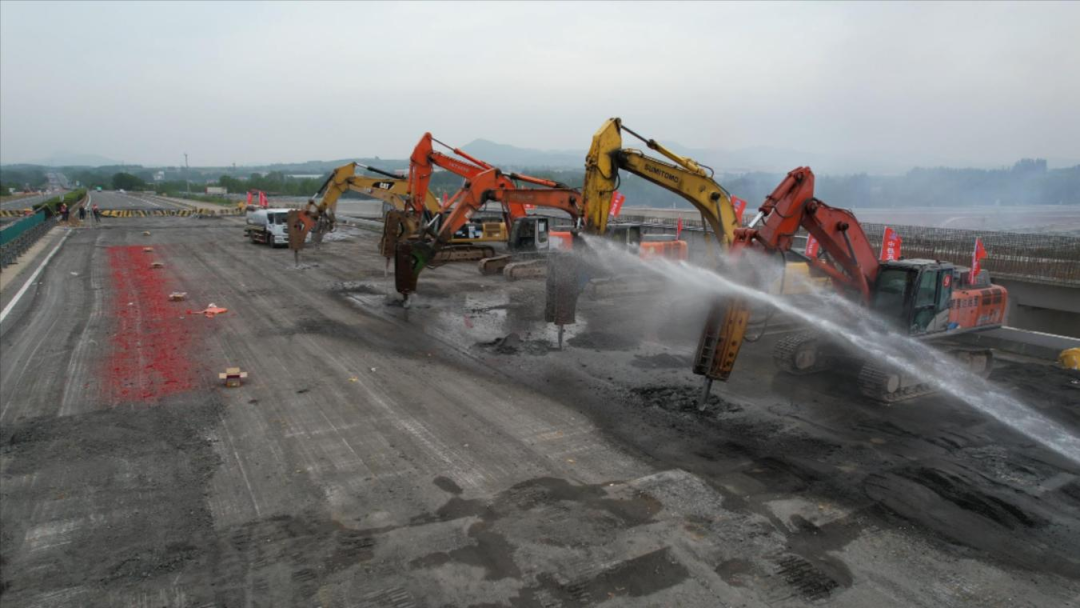 青兰主线桥为双向6车道4跨预应力现浇箱梁桥,最小跨径17米,不仅拆除施工量大,对安全、环保控制标准也很高。施工过程中,交发集团严格遵循相关技术规范,配备足量洒水车、雾炮机等扬尘设备,实施全程湿法作业,最大限度降低拆桥扬尘影响,实现安全与绿色施工双达标。