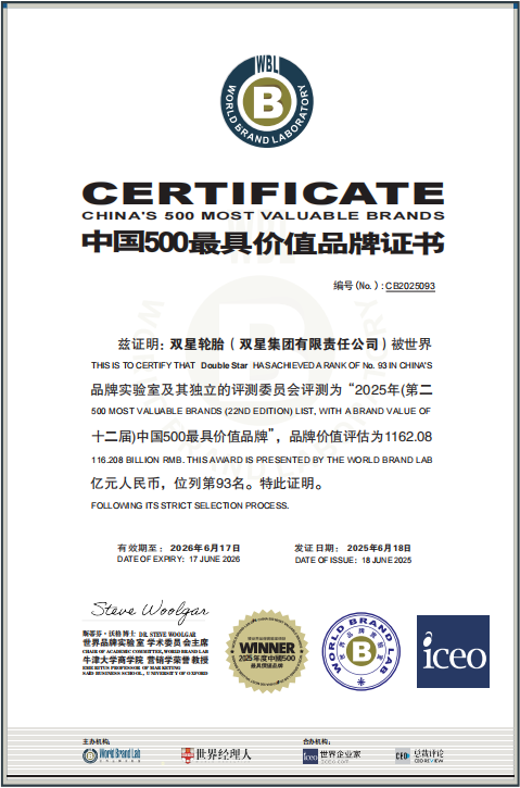 连续多年以行业第一入选“中国500最具价值品牌”,汇聚着用户、社会、行业专家的认可与信任,双星集团将持续深化品牌建设,提供更安全、更智能、更环保的轮胎产品,不断提升用户体验,以扎实的行动推动品牌价值持续增长,为中国轮胎行业的高质量发展贡献力量。