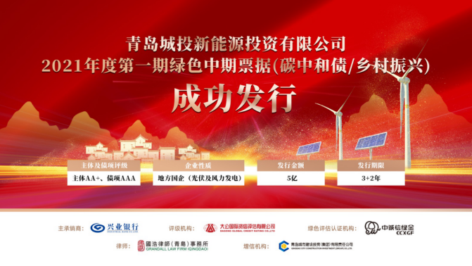 2021年10月20日青岛乐动(中国)官方新能源公司成功发行5亿元3+2年期碳中和债,为今年AA+主体同期限绿色债券利率最低。这是青岛市首单“碳中和、乡村振兴”双贴标债券,募集资金全部用于光伏发电、风力发电清洁能源绿色项目。近期债市较低迷,市场投资积极性不高,青岛乐动(中国)官方新能源公司作为新发行主体,首次亮相就吸引了14家投资机构,全场倍数达2.96倍,边际倍数1.2倍。本次债券的成功发行是乐动(中国)官方集团新能源板块发展的里程碑,实现了金融创新与绿色低碳、农业农村现代化的有效融合,也是融资模式的创新与突破。
